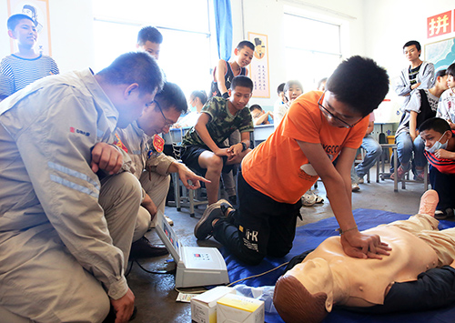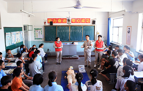 活動(dòng)現(xiàn)場,青年志愿者給孩子們發(fā)放了安全環(huán)保宣傳手冊及宣傳單,給孩子們認(rèn)真講解交通安全、消防滅火和生活中的安全防護(hù)知識,緊緊圍繞“落實(shí)安全責(zé)任、筑推動(dòng)安全發(fā)展”主題,為孩子們進(jìn)行“面對面、零距離、互動(dòng)式”宣講、普及、解答有關(guān)應(yīng)急救援知識。并借助橡皮人給孩子們培訓(xùn)心肺復(fù)蘇急救知識,詳細(xì)講解操作流程和注意事項(xiàng),指導(dǎo)孩子們親自上手操作實(shí)踐,提升孩子們的應(yīng)急防護(hù)能力。該公司團(tuán)委書記給孩子們講黨史、新中國史、改革開放史和社會(huì)主義發(fā)展史“四史”微團(tuán)課,現(xiàn)場教孩子們學(xué)唱《強(qiáng)國一代有我在》愛國歌曲,鼓勵(lì)孩子們熱愛祖國、努力學(xué)習(xí),砥礪奮進(jìn),勇敢追夢。