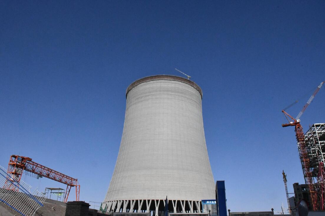 甘肅電投常樂電廠項目超大型自然通風(fēng)間接空冷冷卻塔設(shè)計屬國內(nèi)一流。四號塔身零米直徑為163米,塔高215米,進風(fēng)口高度29米,進風(fēng)口直徑143.8米。由基礎(chǔ)、X柱、環(huán)梁、塔筒等部分組成,于2021年7月上旬開工,X柱采用清水混凝土澆筑,整體澆筑共使用87753立方米混凝土,到頂后的間冷塔筒壁內(nèi)實外光、曲線流暢、模板接茬平整。塔筒為雙曲線形現(xiàn)澆鋼筋混凝土殼體結(jié)構(gòu),這種設(shè)計有效解決了瓜州縣大風(fēng)地區(qū)間冷塔設(shè)計和運行等技術(shù)難題。