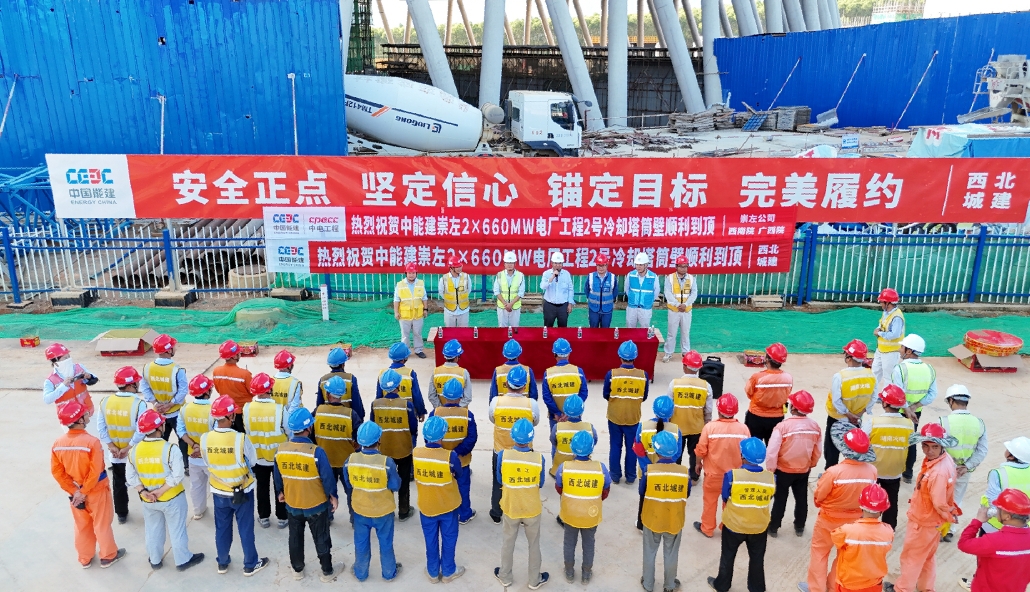 7月25日,中國能建西北城建承建的中能建崇左2×660兆瓦電廠工程2號冷卻塔順利到頂。