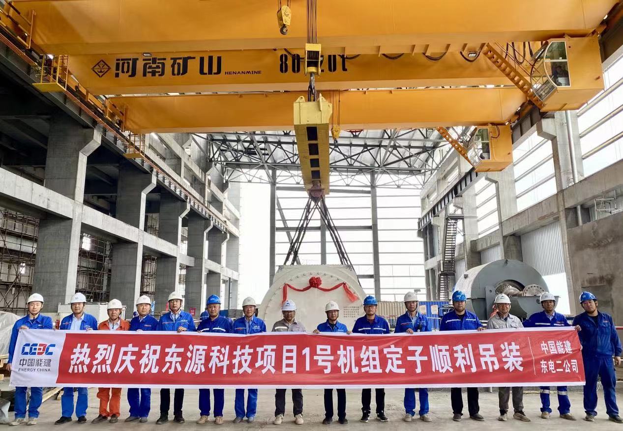 近日,中國能建東電二公司承建的內(nèi)蒙古東源科技2×350兆瓦低熱值煤自備電廠項目1號機組發(fā)電機定子吊裝完成。