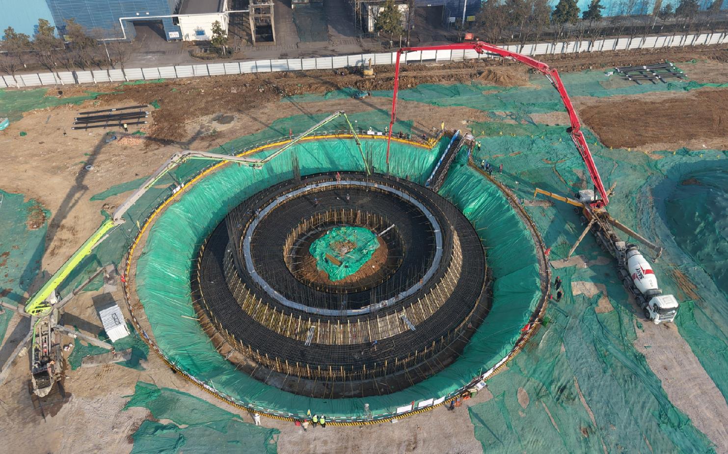 此次7號鍋爐和煙囪基礎采取不間斷接續(xù)施工方式,自1月17日7時40分開始,歷經4天4夜奮戰(zhàn),先后完成了兩區(qū)域大體積混凝土澆筑任務。7號鍋爐筏板長45.9米、寬44.7米,基礎混凝土厚度2.3米,采用2臺63米汽車泵和1臺56米汽車泵,澆筑混凝土總量4673方。煙囪基礎為環(huán)板式,外直徑為38米,澆筑采取用二備一泵車配置,總澆筑方量達2451方。尤為值得一提的是,煙囪基礎自2024年12月26日開挖,于2025年1月20日澆筑完成,僅歷時25天,打破了該公司煙囪基礎施工的最短工期紀錄。