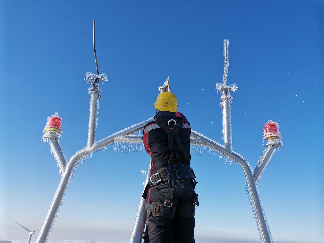11月11日至12日,陽光透過薄薄的云層,照耀著白茫茫的大地,反射出銀色的光芒。風(fēng)機(jī)逐漸恢復(fù)運(yùn)行,在重力和風(fēng)機(jī)葉片旋轉(zhuǎn)的作用下,裹冰會(huì)從葉片上脫落,由于受旋轉(zhuǎn)葉片的離心力作用,這些冰在沒有障礙物遮擋的情況下會(huì)被拋出數(shù)百米遠(yuǎn),存在安全隱患。風(fēng)電場隨即組織人員挨家挨戶告訴村民,近期不得靠近風(fēng)機(jī),注意人身安全。之后開展機(jī)組風(fēng)速儀、風(fēng)向標(biāo)除冰工作,全面降低機(jī)組不可用時(shí)間,保障機(jī)組供電穩(wěn)定可靠。本次除冰消缺充分利用上海電氣風(fēng)機(jī)監(jiān)控系統(tǒng)后臺,通過對比機(jī)組風(fēng)速和風(fēng)向、功率等數(shù)據(jù),分析判斷機(jī)組覆冰情況,對因雨雪冰凍天氣導(dǎo)致的風(fēng)速儀、風(fēng)向標(biāo)覆冰從而影響機(jī)組功率的問題,及時(shí)派出“破冰突擊隊(duì)”。但是機(jī)艙頂部由于積雪、結(jié)冰,變得十分光滑。工作人員佩戴好安全帶,掛好雙鉤,迎難而上,勇敢破冰。同時(shí)也對加熱器、溫度傳感器及相關(guān)回路進(jìn)行細(xì)致檢查,對無法正常運(yùn)行的加熱器進(jìn)行及時(shí)更換,確保設(shè)備加熱良好,回路接線無松動(dòng),風(fēng)速儀、風(fēng)向標(biāo)工作正常。