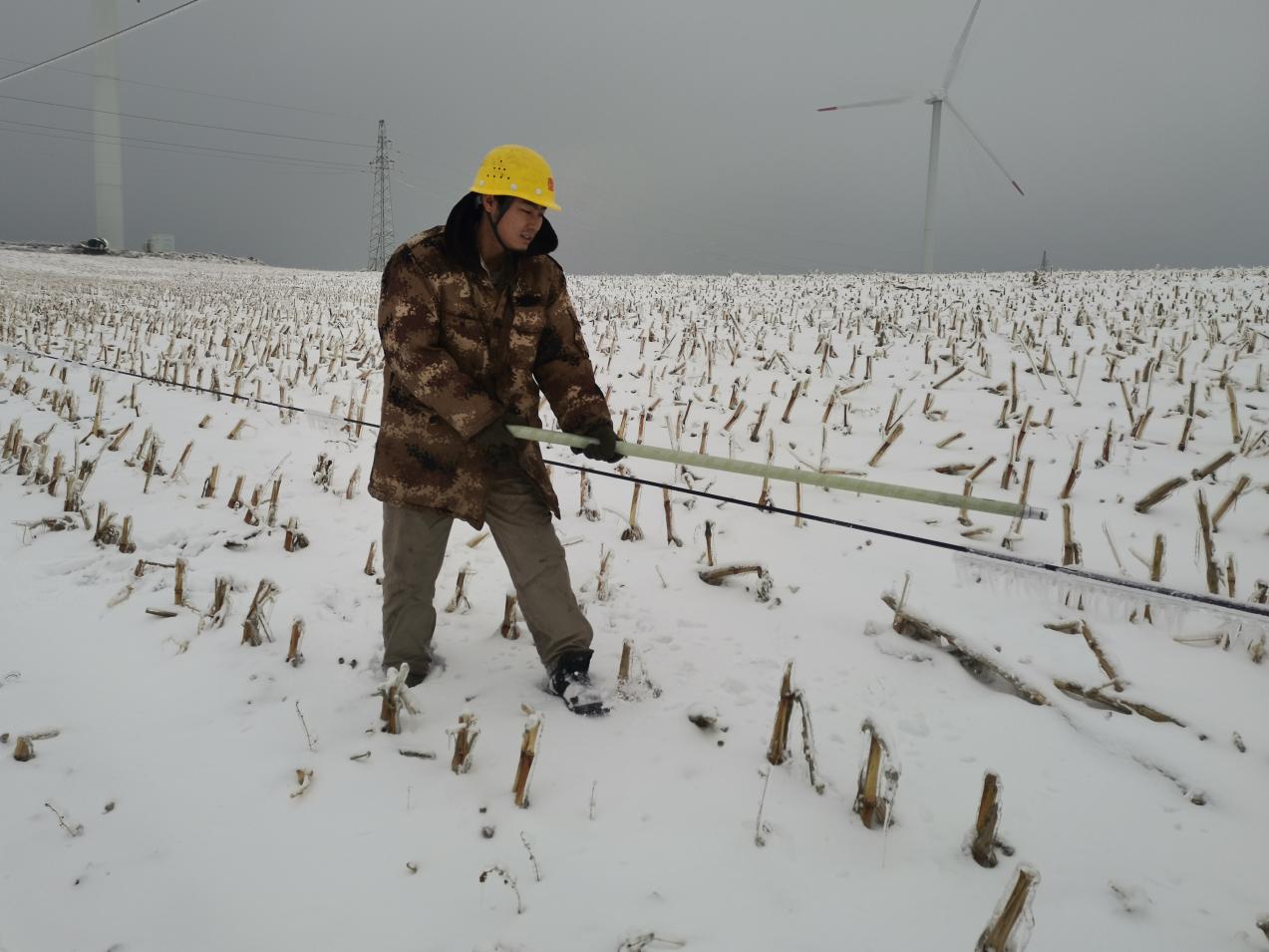 11月10日,瑟瑟寒風(fēng)能吹開地上的積雪,卻無法阻止破冰小隊(duì)的腳步。這場持續(xù)兩天的雨雪剛一停,風(fēng)電場立即組織人員兵分兩路,迅速趕往現(xiàn)場。一組對升壓站35kV側(cè)通訊光纖、220kV側(cè)高壓一次設(shè)備采取人工打冰的方式對覆冰部位進(jìn)行處理,確保線路安全,以及再對升壓站電纜溝蓋板進(jìn)行清掃。另一組首先對風(fēng)機(jī)變頻器冷卻風(fēng)扇散熱網(wǎng)上的“冰罩”進(jìn)行破冰。避免風(fēng)機(jī)復(fù)位運(yùn)行后,變頻器冷卻風(fēng)扇散熱不及時(shí)的情況,導(dǎo)致設(shè)備損壞。之后再對線路進(jìn)行檢查,因受大風(fēng)和凍雨混合雙打,集電線路被冰包裹得嚴(yán)嚴(yán)實(shí)實(shí)的。經(jīng)檢查后并無損壞,否則電線結(jié)冰后,既要承受冰掛的重量,加上風(fēng)的影響,致使電線被壓斷。同時(shí),電塔也可能會(huì)承受較往常多十幾倍的電線重量,從而造成傾倒或折斷。還好只是塔架固定掉落,加上冰的重量才“葛優(yōu)躺”在地面上?,F(xiàn)場用絕緣桿進(jìn)行人工敲打。隨著敲打的進(jìn)行,電纜逐漸升起,這也減少了發(fā)生事故的可能。