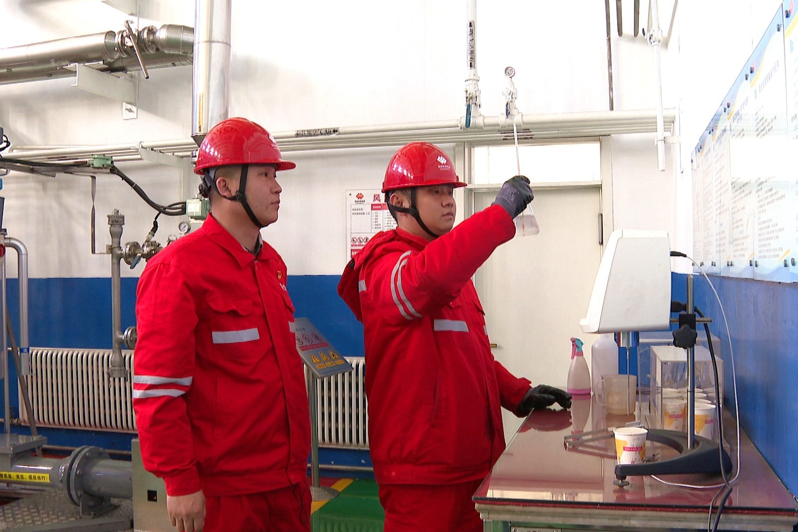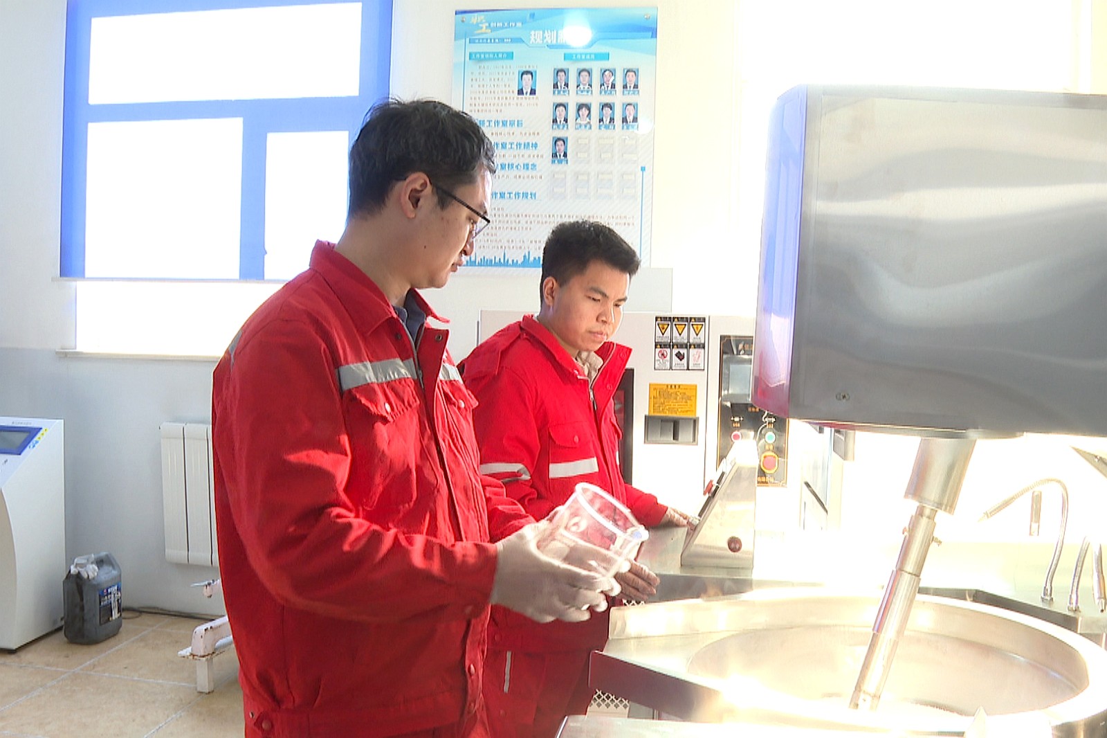 圖為侯鵬飛和徒弟趙博宇正在進(jìn)行乳膠基質(zhì)黏度檢測(cè)