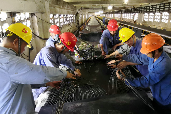 P106B膠帶整體更換膠帶全長2300米,共需硫化接頭20個(gè),是整個(gè)輸煤系統(tǒng)膠帶更換工作中最難啃的一塊"硬骨頭"。為確保此次膠帶更換工作順利完成,該公司多次召開檢修專題討論會(huì),制定了組織、安全、技術(shù)措施及詳細(xì)的施工方案,成立兩個(gè)硫化組,一個(gè)物資保障收放組,實(shí)行24小時(shí)輪班作業(yè),保證施工的持續(xù)性和連貫性。針對(duì)舊膠帶的拆除、拖拽、新膠帶的吊裝、鋪設(shè)等施工難點(diǎn),創(chuàng)新工作思路,開展技術(shù)攻關(guān)破解難題,自制了自動(dòng)卷帶機(jī),減少了人工投入,極大提高了工作效率,特別是在攻克硫化接頭方面,嚴(yán)格施工標(biāo)準(zhǔn)和工藝流程操作,經(jīng)過斷帶、剝鋼絲繩、芯膠面膠鋪整、硫化機(jī)緊固、加壓、加熱、再進(jìn)行保溫降溫等施工程序,每個(gè)頭用時(shí)8多個(gè)小時(shí),做到精益求精,確保一次硫化成功,保證硫化質(zhì)量。