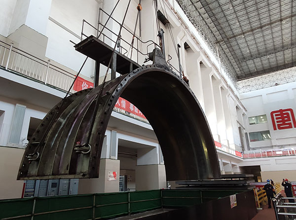 該公司密切關注本次轉輪室吊裝作業(yè),2號機組轉輪室上半部重約16噸,為確保本次吊裝工作的順利進行,該公司根據(jù)現(xiàn)場情況,對參與本次吊裝工作的全體人員進行安全技術交底,所有工作人員清楚工作內容、方法和要求。同時監(jiān)督吊裝作業(yè)各項措施全部落實到位,明確各項責任。在吊裝過程中,工作負責人和橋機指揮人員密切關注轉輪室擺動幅度,及時進行方位調整,各部位設專人負責,各環(huán)節(jié)做到無縫銜接,最終圓滿完成了2號機組轉輪室上半部吊裝工作。