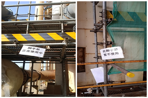 針對(duì)檢查發(fā)現(xiàn)的現(xiàn)場(chǎng)腳手架使用狀態(tài)信息無(wú)法識(shí)別,安全警示不到位的問題,公司領(lǐng)導(dǎo)高度重視,EHS部立即組織各檢修單位召開專題會(huì),明確要求各單位進(jìn)一步完善腳手架搭建驗(yàn)收后的管理要求,對(duì)現(xiàn)場(chǎng)所有腳手架進(jìn)行排查梳理,完善“搭建中、驗(yàn)收合格可使用、暫不使用、待拆除”等各種狀態(tài)信息牌,確保高處作業(yè)風(fēng)險(xiǎn)可控、在控。