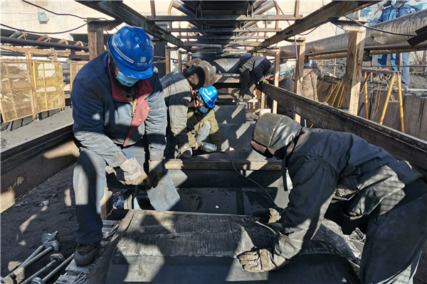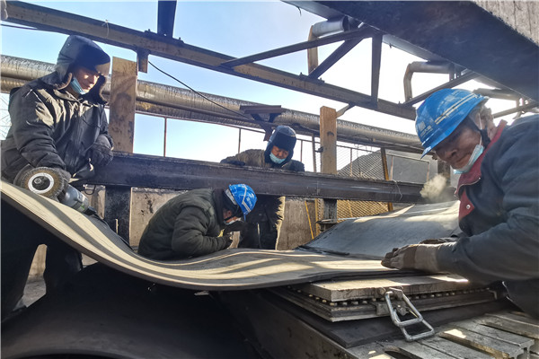 5日上午,工作人員做好粘接皮帶準備工作,負責這次搶修工作的皮帶班,目前編制只有三名職工,承擔此次工作,顯然兩天內(nèi)完不成皮帶粘接任務,燃運分場打破常規(guī),合理分配人員,調(diào)派分場其他班組支援搶修,在剛剛完成三天搶修任務的情況下,克服困難繼續(xù)投入到搶修中。他們分工作業(yè)、分組負責,一組用電火焊、導鏈、撬棍等工具修復皮帶滾筒,一組對斷裂皮帶進行切割、打磨、對口、清洗、粘接和硫化等處理,同樣是在室外寒冷天氣搶修,汗水浸濕了他們的衣領和帽子,加上空間狹小,他們克服了重重困難,團結(jié)作戰(zhàn),中午來不及休息,午飯后又繼續(xù)搶修工作,沒有一個人叫苦叫累,以頑強的毅力完成了當天的皮帶粘接任務。