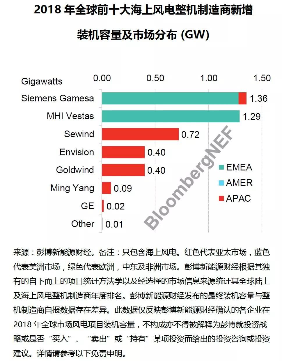 Siemens Gamesa2018年全球海上風電新增裝機容量為1.36GW,市場份額達32%,繼續(xù)領(lǐng)跑全球海上風電市場。