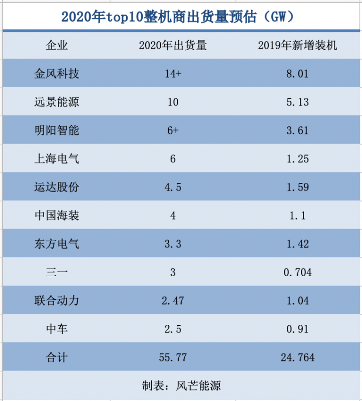 根據(jù)風(fēng)芒能源問詢、統(tǒng)計(jì)以及預(yù)估,2020年全年,排名前十的整機(jī)商出貨量將超過50GW左右。相較于光伏行業(yè)動態(tài)變化的集中趨勢,風(fēng)電整機(jī)商的排名及市占率基本保持穩(wěn)定。其中,TOP3的整機(jī)商金風(fēng)科技、遠(yuǎn)景能源、明陽智能累計(jì)出貨量超過30GW,三家市場占比最終預(yù)計(jì)在60%左右,與2019年的62.6%比,雖受搶裝影響,三家市占率稍有減弱,但行業(yè)集中度基本未受影響。