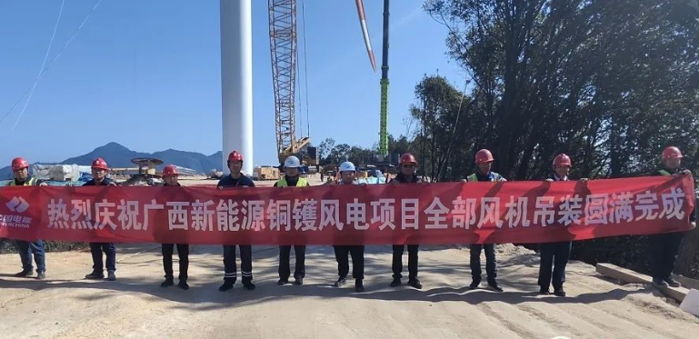 銅鑊工區(qū)位于廣西梧州龍圩區(qū)大坡鎮(zhèn),占地面積約7.3平方公里,一期總裝機容量為50兆瓦,共安裝10臺5兆瓦風(fēng)電機組,配套建設(shè)一座110千伏升壓站。