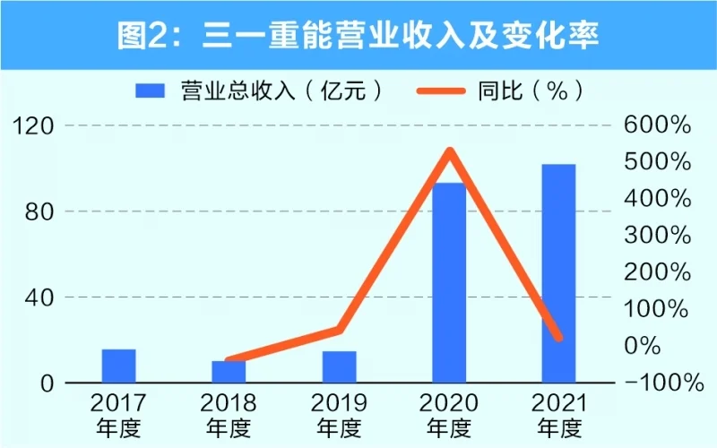 得益于風(fēng)電行業(yè)整體的快速發(fā)展,以及公司自身產(chǎn)品的逐步成熟,及補貼退坡前的風(fēng)電搶裝潮驅(qū)動,三一重能業(yè)務(wù)規(guī)模呈現(xiàn)跨越式發(fā)展。2019年至2021年,三一重能分別實現(xiàn)營業(yè)收入14.81億元、93.11億元和101.75億元,同比增長43.14%、528.57%和9.28%(見圖)。