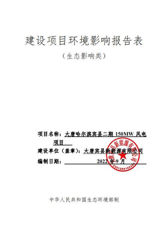 大唐哈爾濱賓縣二期150MW風電項目環(huán)境影響報告