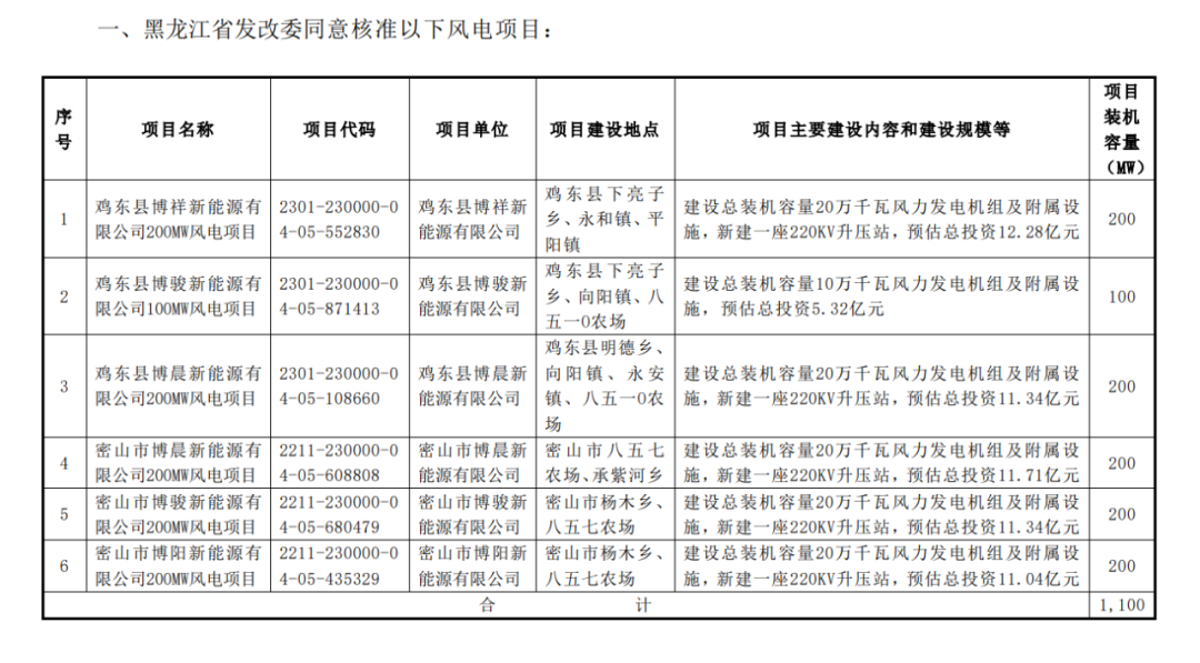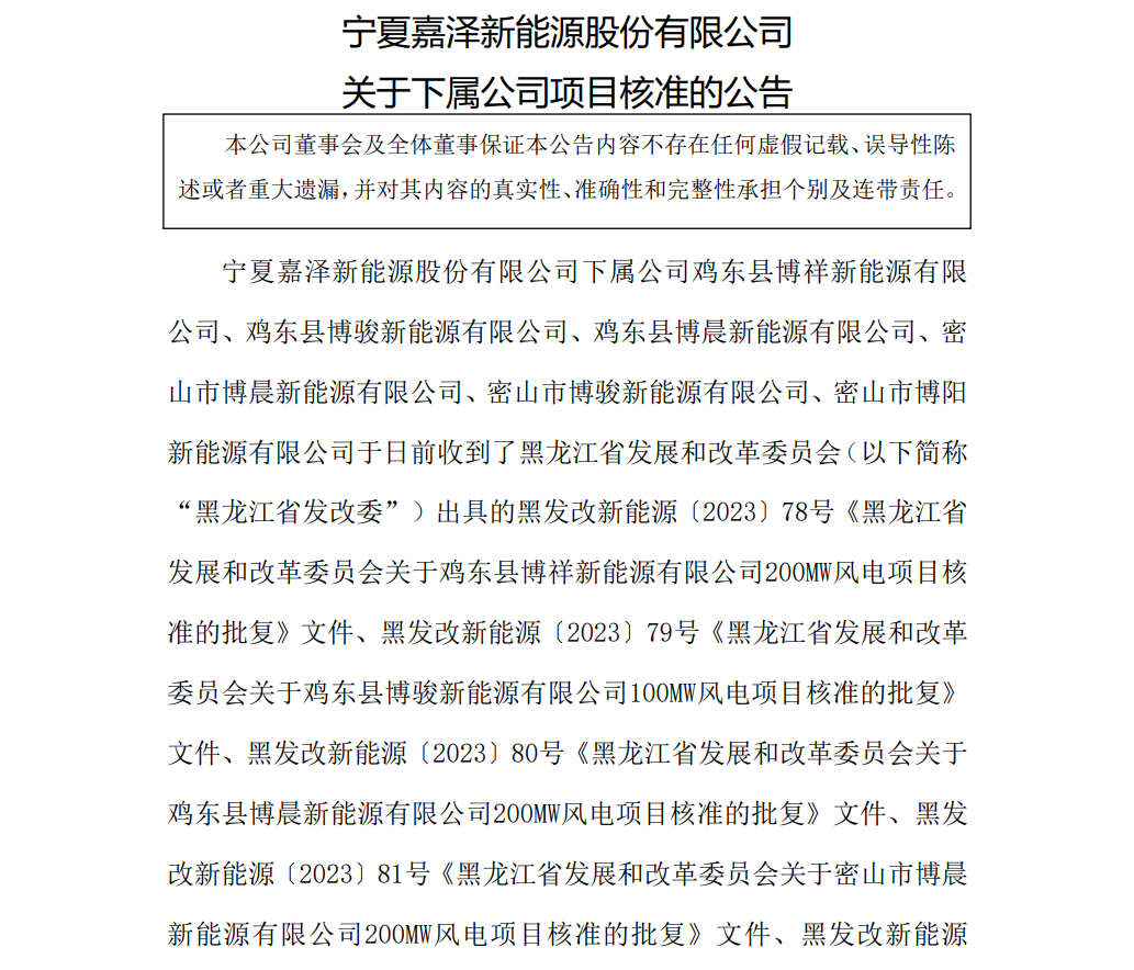 公告披露,寧夏嘉澤新能源股份有限公司下屬公司于日前收到了黑龍江省發(fā)展和改革委員會(huì)(以下簡稱“黑龍江省發(fā)改委”)出具的風(fēng)電項(xiàng)目核準(zhǔn)的批復(fù)文件,共計(jì)六個(gè)風(fēng)電項(xiàng)目獲得核準(zhǔn),總裝機(jī)容量為1100MW。