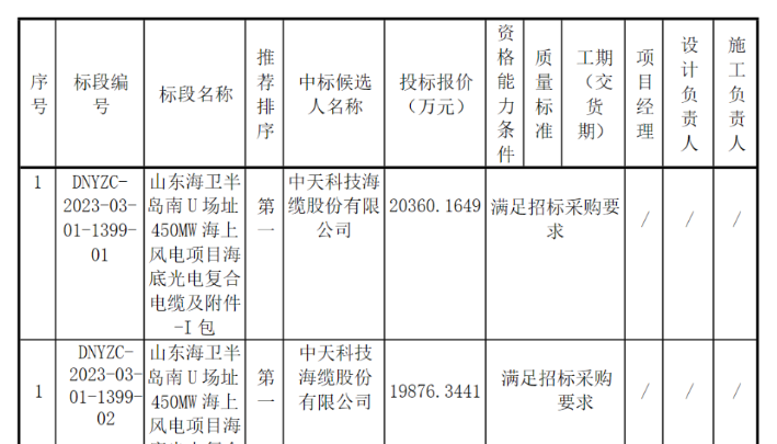 7月14日,國(guó)家電投電子商務(wù)平臺(tái)發(fā)布《國(guó)家電力投資集團(tuán)有限公司二〇二三年度第十七批集中招標(biāo)(山東分公司海衛(wèi)半島南 U場(chǎng)址450MW海上風(fēng)電項(xiàng)目海底光電復(fù)合電纜及附件)中標(biāo)候選人公示》的公告。