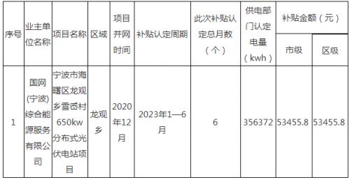 根據(jù)《寧波市家庭屋頂光伏補(bǔ)貼專項(xiàng)資金管理暫行辦法》(甬發(fā)改能源〔2018〕36號)、《海曙區(qū)節(jié)能降耗專項(xiàng)資金管理辦法》(海發(fā)改〔2019〕36號)等文件精神,海曙區(qū)2023年上半年符合非自然人家庭屋頂光伏發(fā)電補(bǔ)貼項(xiàng)目共1個(gè),總并網(wǎng)容量650kw,2023年上半年補(bǔ)貼發(fā)電周期為2023年1月1日至2023年6月30日,合計(jì)發(fā)電量356372千瓦時(shí),需撥付補(bǔ)貼資金106911.6元(其中:市級補(bǔ)貼資金53455.8元,區(qū)級配套補(bǔ)助資金53455.8元)。