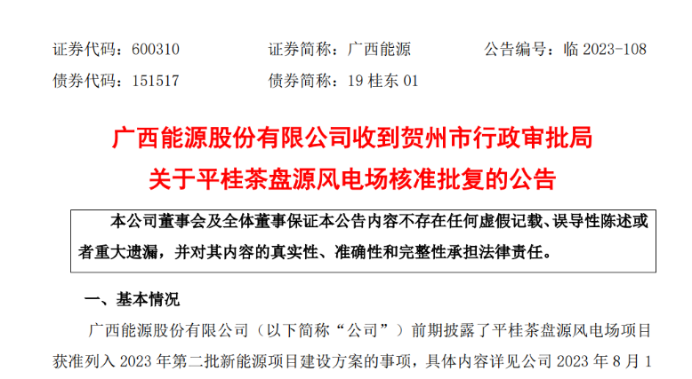 公告披露,2023年11月6日,廣西能源收到《賀州市行政審批局關(guān)于平桂茶盤源風(fēng)電場核準的批復(fù)》(賀審批項目〔2023〕1 號),核準建設(shè)平桂茶盤源風(fēng)電場項目。