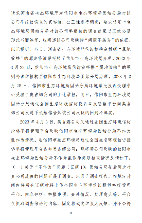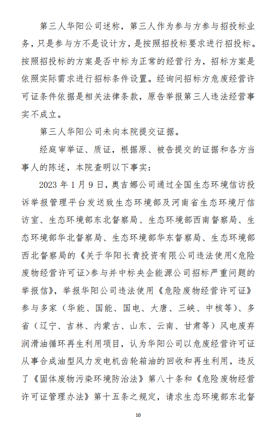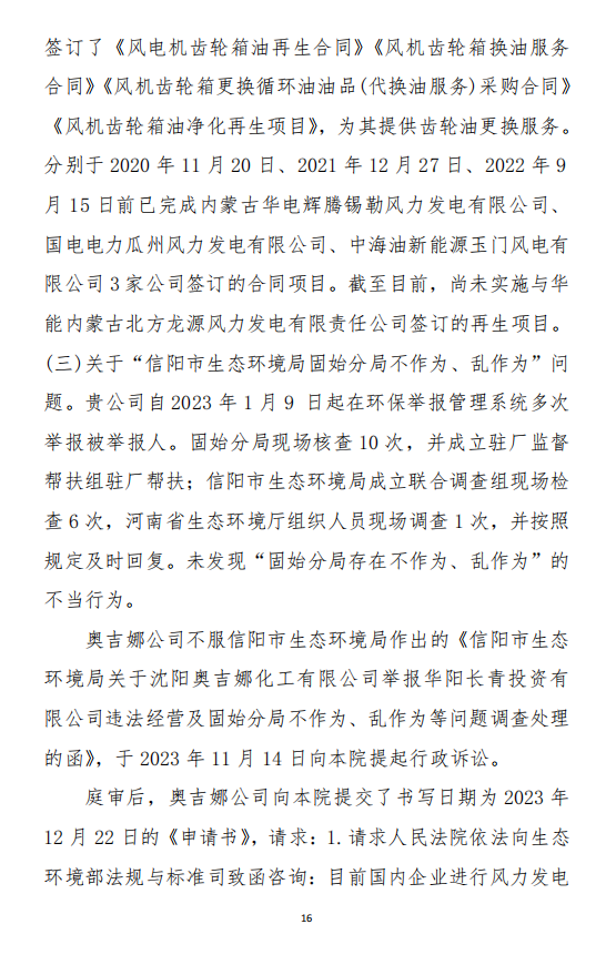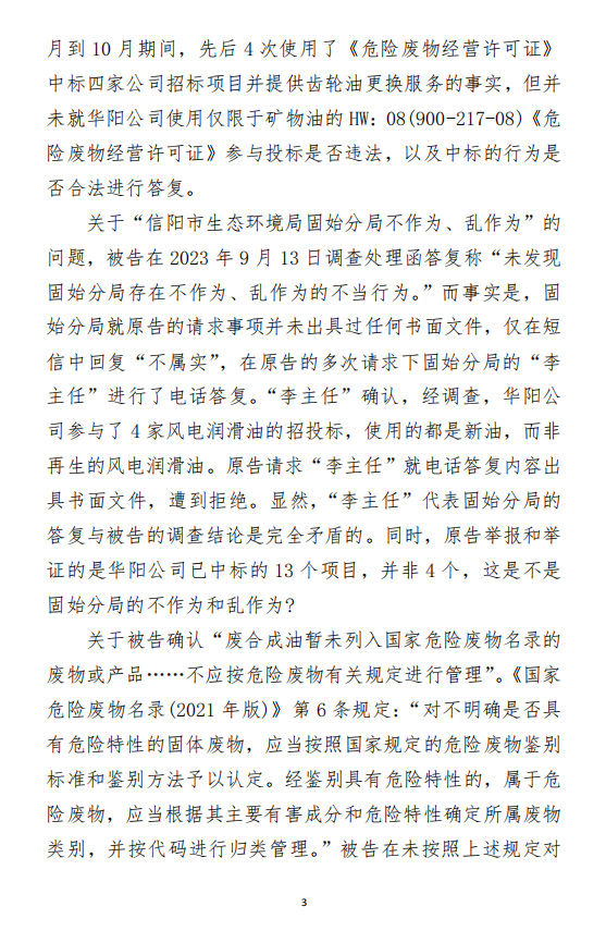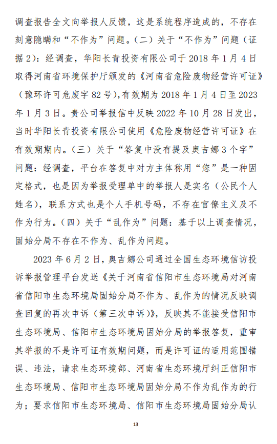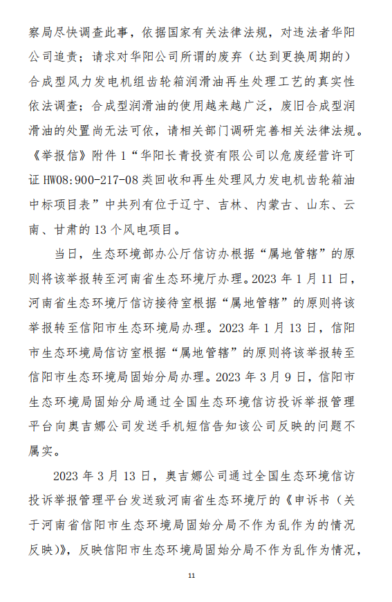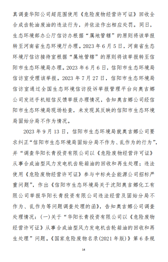 2023年3月9日,奧吉娜公司收到固始分局通過12369環(huán)境信訪平臺(tái)的短信答復(fù):“反映問題不屬實(shí)”。3月10日,奧吉娜公司向固始分局負(fù)責(zé)人電話詢問,其解釋稱:經(jīng)調(diào)查核實(shí),華陽長青公司沒有再生風(fēng)電潤滑油銷售,出售的是新油。否定了奧吉娜公司的舉報(bào)內(nèi)容。對(duì)此,奧吉娜公司表示強(qiáng)烈不滿。3月11日,奧吉娜公司向環(huán)境部投訴固始分局的不作為和亂作為。2023年5月26日,奧吉娜公司收到12369環(huán)境信訪平臺(tái)的短信答復(fù)。答復(fù)部門為信陽環(huán)境局。令人啼笑皆非的是,答復(fù)稱,華陽長青的許可證有效期沒有問題,與舉報(bào)內(nèi)容風(fēng)馬牛不相及。2023年6月13日,奧吉娜公司再次向環(huán)境部提出申訴,指出,奧吉娜舉報(bào)的不是許可證有效期問題,而是許可證的適用范圍錯(cuò)誤、違法。2023年7月27日,奧吉娜公司收到回復(fù)稱,經(jīng)信陽市生態(tài)環(huán)境局現(xiàn)場(chǎng)檢查,未發(fā)現(xiàn)固始分局不作為情況。2023年8月3日,奧吉娜公司向河南省生態(tài)環(huán)境廳(以下稱:環(huán)境廳)舉報(bào)信陽環(huán)境局包庇固始分局的行為。環(huán)境廳對(duì)此高度重視,有關(guān)處長和奧吉娜公司負(fù)責(zé)人進(jìn)行了面談。2023年9月13日,信陽環(huán)境局向奧吉娜公司致《信陽市生態(tài)環(huán)境局關(guān)于沈陽奧吉娜化工有限公司舉報(bào)華陽長青投資有限公司違法經(jīng)營及固始分局不作為、亂作為等問題調(diào)查處理的函》。函中:一是,以“齒輪箱”替換“齒輪箱油”,偷換概念;二是,做出了廢風(fēng)電合成(齒輪)油不屬于危險(xiǎn)廢物的結(jié)論;三是,未發(fā)現(xiàn)固始分局存在不作為、亂作為的不當(dāng)行為。再次否定奧吉娜公司的舉報(bào)和投訴。