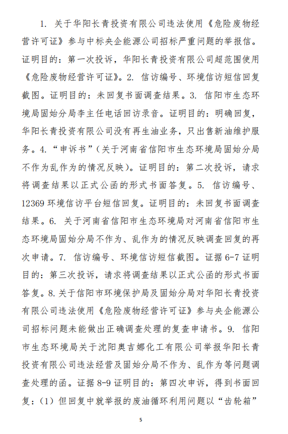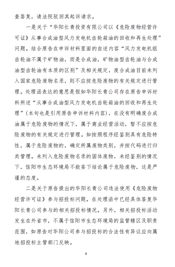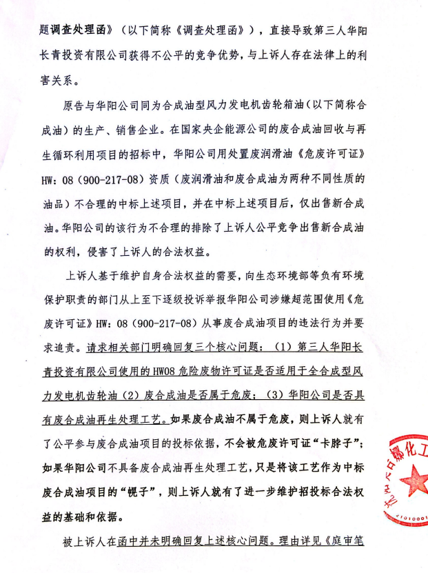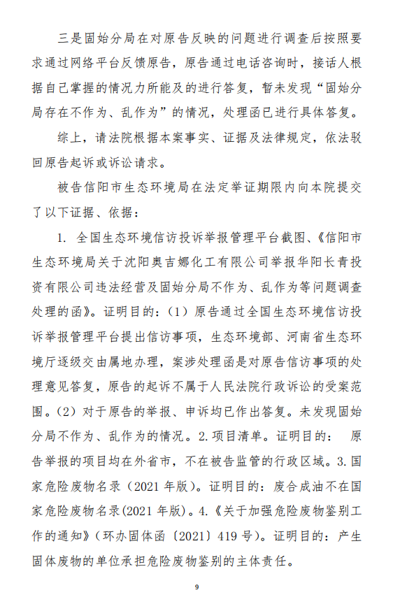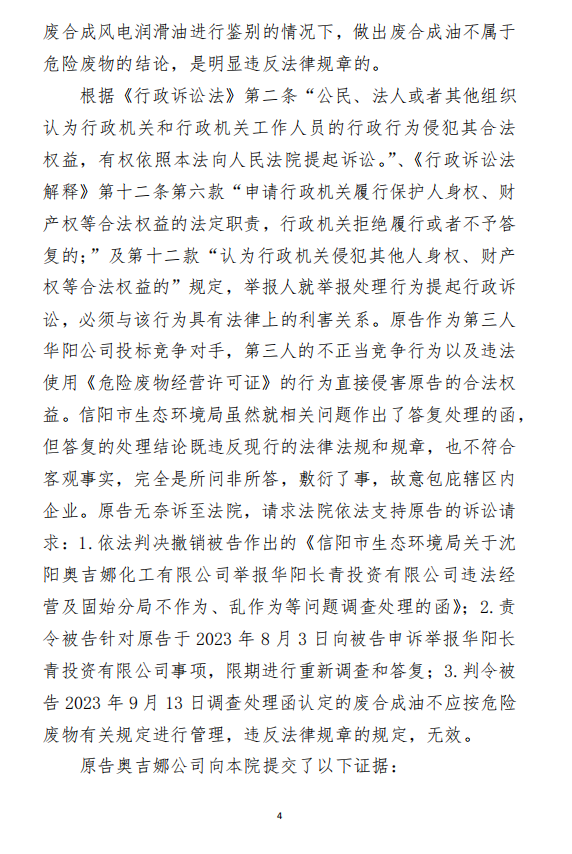 2、訴訟請(qǐng)求:請(qǐng)求人民法院判決撤銷被告作出的《信陽市生態(tài)環(huán)境局關(guān)于沈陽奧吉娜化工有限公司舉報(bào)華陽長青投資有限公司違法經(jīng)營及固始分局不作為、亂作為等問題調(diào)查處理的函》;責(zé)令被告對(duì)原告向被告舉報(bào)華陽長青投資有限公司事項(xiàng),限期進(jìn)行重新調(diào)查和答復(fù);判令被告認(rèn)定的廢合成油不應(yīng)按危險(xiǎn)廢物有關(guān)規(guī)定進(jìn)行管理違反法律規(guī)章規(guī)定,無效。