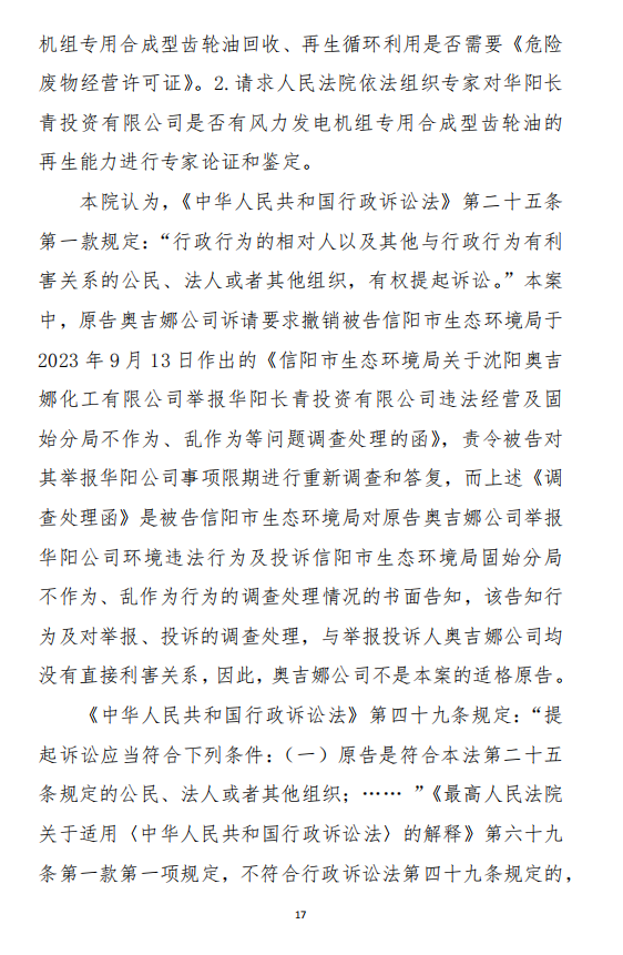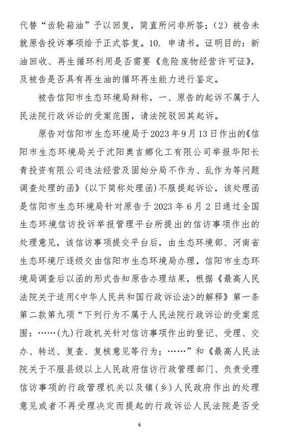 2023年10月18日,奧吉娜公司依據(jù)《行政訴訟法》和《行政訴訟法解釋》,將信陽市環(huán)境局和第三人華陽長青公司訴至信陽市平橋區(qū)人民法院,請(qǐng)求法院:1、判決撤銷被告作出的《信陽市生態(tài)環(huán)境局關(guān)于沈陽奧吉娜化工有限公司舉報(bào)華陽長青投資有限公司違法經(jīng)營及固始分局不作為、亂作為等問題調(diào)查處理的函》;2、責(zé)令被告針對(duì)原告于2023年8月3日向被告申訴舉報(bào)華陽長青投資有限公司事項(xiàng),限期進(jìn)行重新調(diào)查和答復(fù);3、請(qǐng)求人民法院判令被告2023年9月13日調(diào)查處理函認(rèn)定的廢合成油不應(yīng)按危險(xiǎn)廢物有關(guān)規(guī)定進(jìn)行管理,違反法律規(guī)章的規(guī)定,無效。