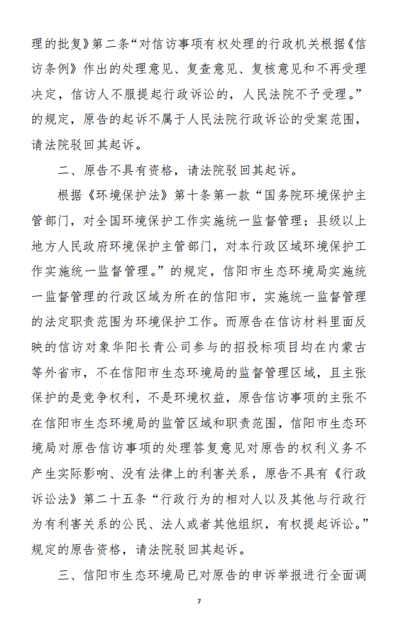 法院的裁定理由是:被告的《信陽市生態(tài)環(huán)境局關(guān)于沈陽奧吉娜化工有限公司舉報(bào)華陽長青投資有限公司違法經(jīng)營及固始分局不作為、亂作為的問題調(diào)查處理函》(下稱《調(diào)查處理函》)與原告訴請(qǐng)沒有利害關(guān)系,因此,原告沒有訴訟資格,下附一:《河南省信陽市平橋區(qū)人民法院行政裁定書》(18頁)。