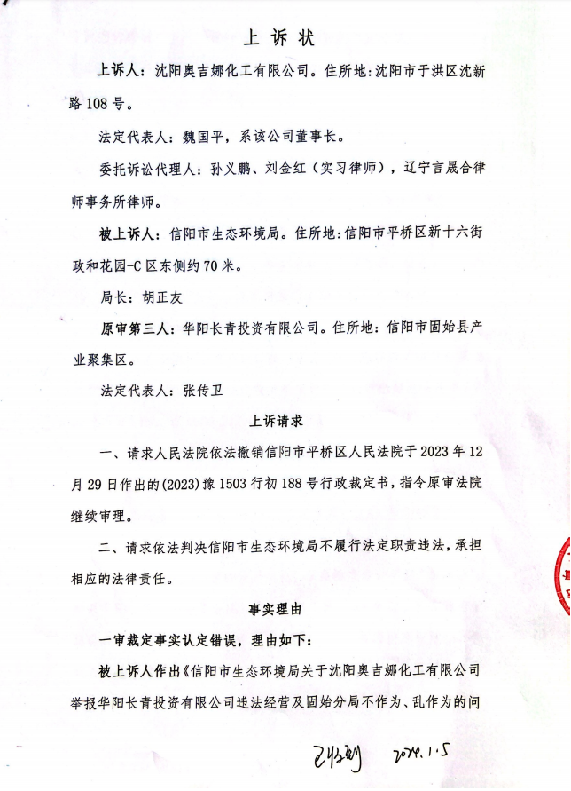 本網(wǎng)訊 中國風(fēng)電潤滑油龍頭企業(yè)沈陽奧吉娜化工有限公司(下簡稱:奧吉娜公司或原告)訴信陽市生態(tài)環(huán)境局(被告)和第三人華陽長青投資有限公司(下簡稱:華陽長青公司)行政訴訟案,河南省信陽市平橋區(qū)人民法院于2023年12月29日作出行政裁定:駁回原告沈陽奧吉娜化工有限公司的起訴。