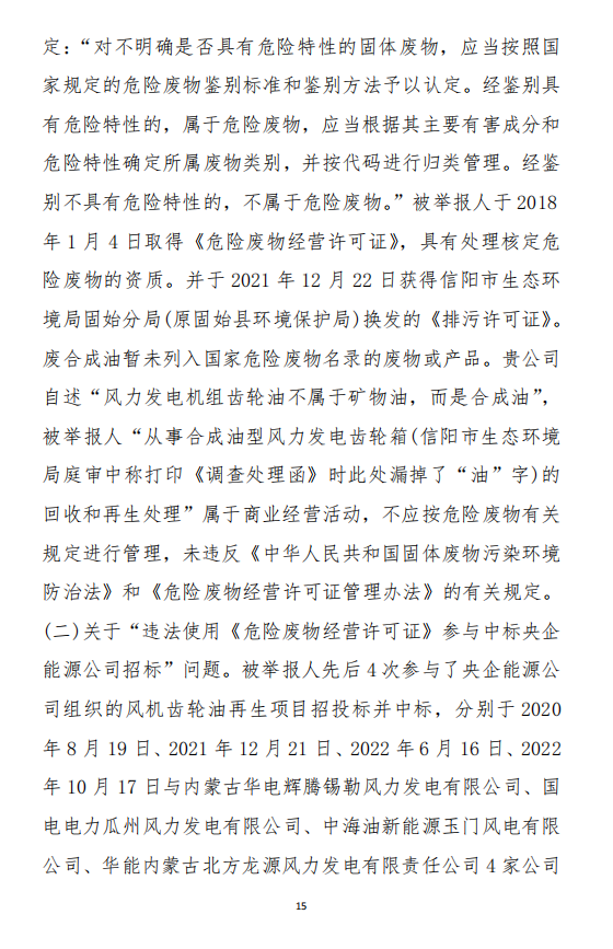奧吉娜公司在參與各央企風(fēng)電潤滑油招投標(biāo)采購中發(fā)現(xiàn),注冊(cè)于河南省信陽市固始縣的華陽長青投資有限公司(以下稱:華陽長青公司),憑借其持有的《危險(xiǎn)廢物經(jīng)營許可證》,屢次以“風(fēng)電齒輪油再生利用”的名義中標(biāo)。然而,奧吉娜公司發(fā)現(xiàn),華陽長青公司的《危險(xiǎn)廢物經(jīng)營許可證》適用范圍并不包含合成型廢風(fēng)電齒輪油,屬于違規(guī)使用,涉嫌違反《環(huán)境保護(hù)法》。于是,2022年10月18日,奧吉娜公司依法向國家生態(tài)環(huán)境部(以下稱:環(huán)境部)進(jìn)行舉報(bào)。按程序,舉報(bào)調(diào)查由信陽市生態(tài)環(huán)境局固始分局(以下稱:固始分局)辦理。