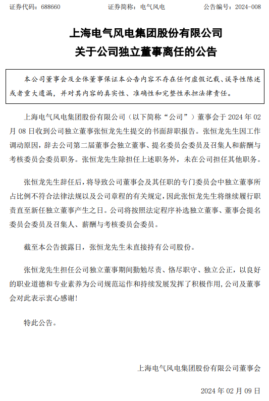公告稱,電氣風電董事會于2024年2月8日收到公司獨立董事張恒龍先生提交的書面辭職報告。張恒龍先生因工作調(diào)動原因,辭去公司第二屆董事會獨立董事、提名委員會委員及召集人和薪酬與考核委員會委員職務。張恒龍先生除擔任上述職務外,未在公司擔任其他職務。