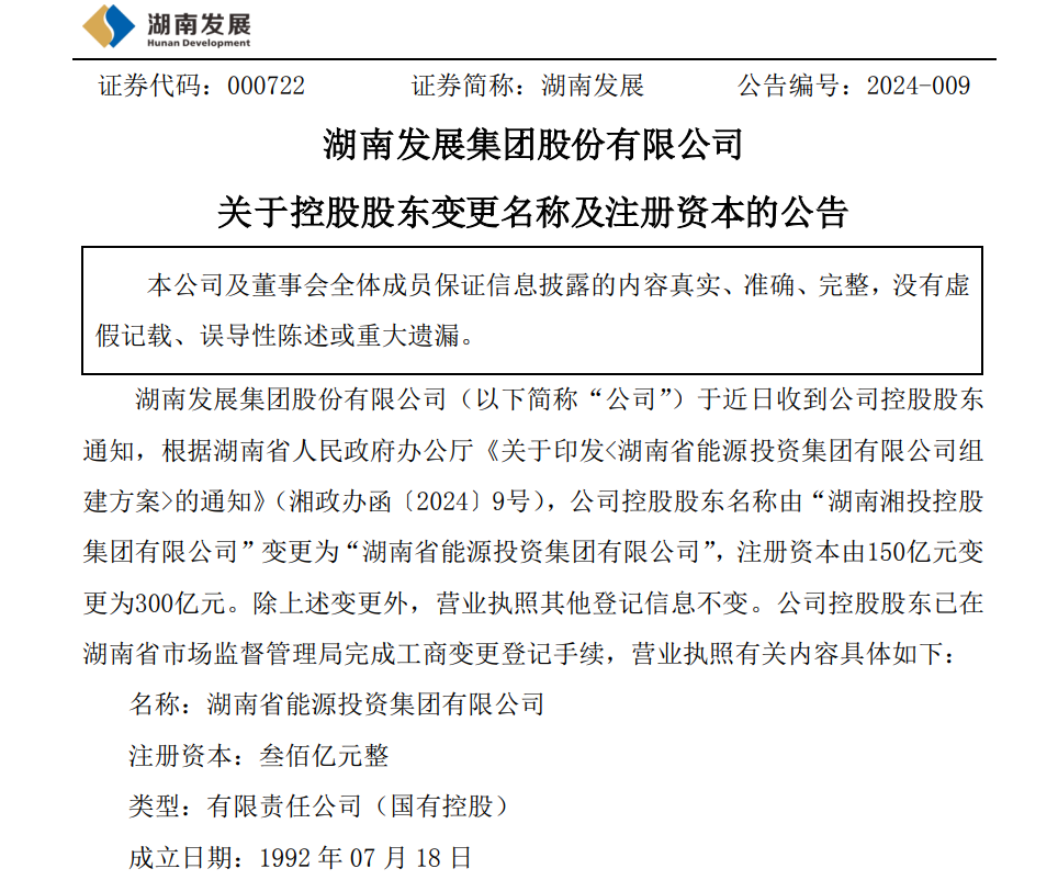 公告顯示,湖南發(fā)展于近日收到公司控股股東通知,根據(jù)湖南省人民政府辦公廳《關(guān)于印發(fā)<湖南省能源投資集團(tuán)有限公司組建方案>的通知》(湘政辦函〔2024〕9號(hào)),公司控股股東名稱由“湖南湘投控股集團(tuán)有限公司”變更為“湖南省能源投資集團(tuán)有限公司”,注冊資本由150億元變更為300億元。除上述變更外,營業(yè)執(zhí)照其他登記信息不變。公司控股股東已在湖南省市場監(jiān)督管理局完成工商變更登記手續(xù)。