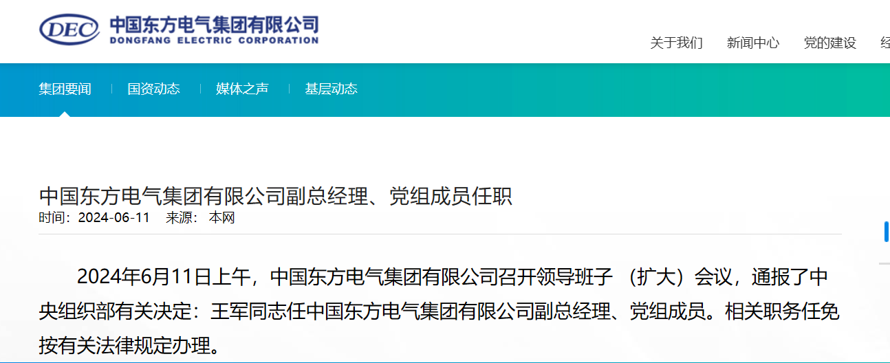 2024年6月11日上午,中國東方電氣集團(tuán)有限公司召開領(lǐng)導(dǎo)班子 (擴(kuò)大)會議,通報了中央組織部有關(guān)決定:王軍同志任中國東方電氣集團(tuán)有限公司副總經(jīng)理、黨組成員。相關(guān)職務(wù)任免按有關(guān)法律規(guī)定辦理。