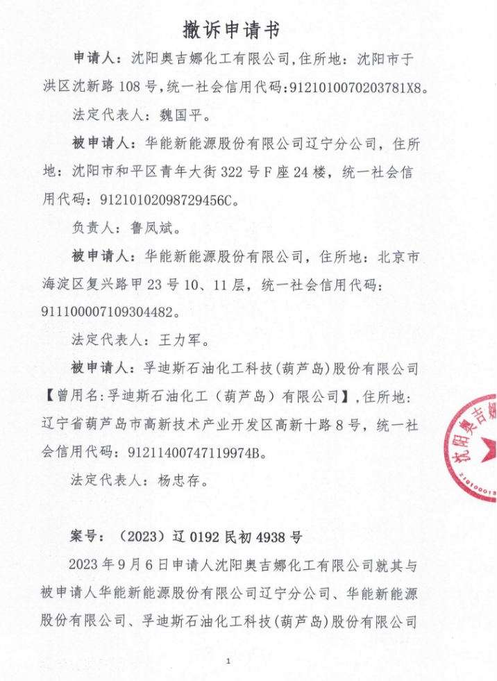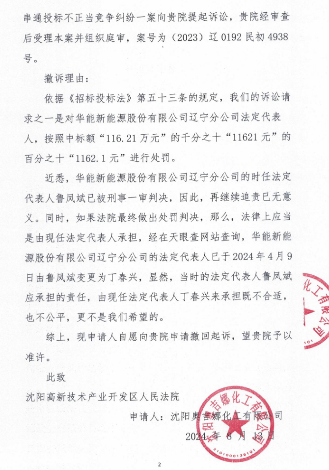 2024年8月13日下午,中國風電潤滑油龍頭企業(yè)沈陽奧吉娜化工有限公司(下稱:奧吉娜公司)訴華能新能源股份有限公司遼寧分公司(下稱:華能新能源遼寧分公司或被告一)、華能新能源股份有限公司和孚迪斯石油化工(葫蘆島)有限公司(下稱:被告三)招投標串通案(案號:(2023)遼 0192 民初 4938號),定在沈陽高新技術產業(yè)開發(fā)區(qū)人民法院自由貿易試驗區(qū)人民法庭第三次開庭,開庭前奧吉娜公司遞交了撤訴申請書,法院裁定準許撤訴。
