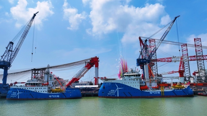 8月16日,上海振華重工為上海電氣風電集團股份有限公司建造的亞洲首制風電運維母船“至臻100”“至誠60”在振華啟東海工命名交付。