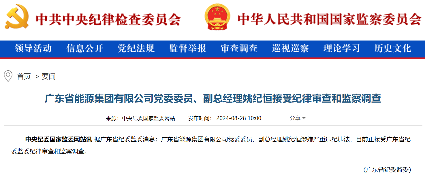 8月28日,中央紀(jì)委國家監(jiān)委網(wǎng)站訊 據(jù)廣東省紀(jì)委監(jiān)委消息:廣東省能源集團(tuán)有限公司黨委委員、副總經(jīng)理姚紀(jì)恒涉嫌嚴(yán)重違紀(jì)違法,目前正接受廣東省紀(jì)委監(jiān)委紀(jì)律審查和監(jiān)察調(diào)查。
