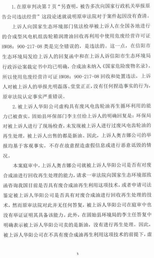 因發(fā)現(xiàn)華陽長青投資有限公司(下稱:長青公司。位于河南省信陽市固始縣)在多家央企風電潤滑油招投標過程中,違法使用只適用于廢礦物油回收處置的《危險廢物經(jīng)營許可證》HW08:900-217-08,回收處置廢合成型風力發(fā)電機組齒輪油(下稱:廢風電齒輪油)問題,沈陽奧吉娜化工有限公司(下稱:奧吉娜公司)自2022年10月18日起,多次向國家生態(tài)環(huán)境部及直屬部門進行實名舉報。因不接受信陽市生態(tài)環(huán)境局固始分局的多次答復和信陽市生態(tài)環(huán)境局的調(diào)查處理結(jié)論,奧吉娜公司遂以不作為和亂作為為由,起訴信陽市生態(tài)環(huán)境局(長青公司為第三人),經(jīng)過固始縣法院的一審、信陽市中級法院的二審、以及河南省高級人民法院的三審,均以奧吉娜公司為“不適格原告”(用白話講,就是沒有起訴資格)為由,裁定駁回起訴、上訴和申訴。
