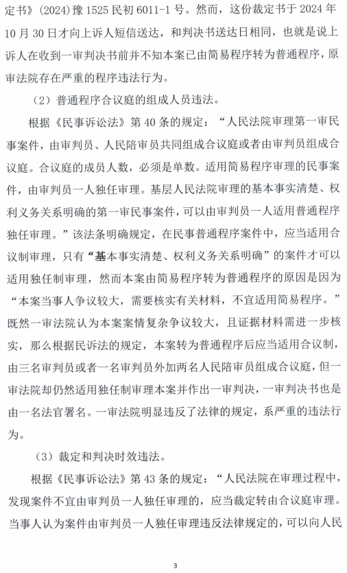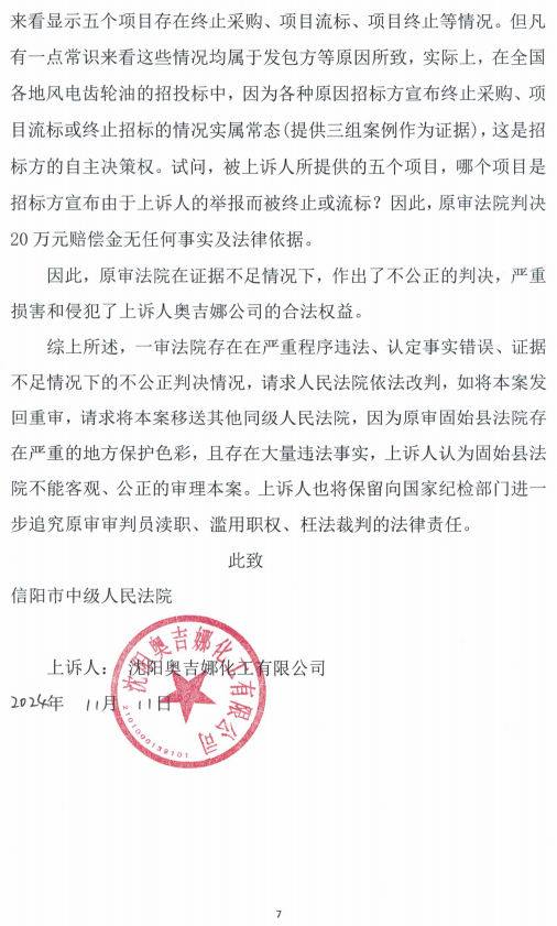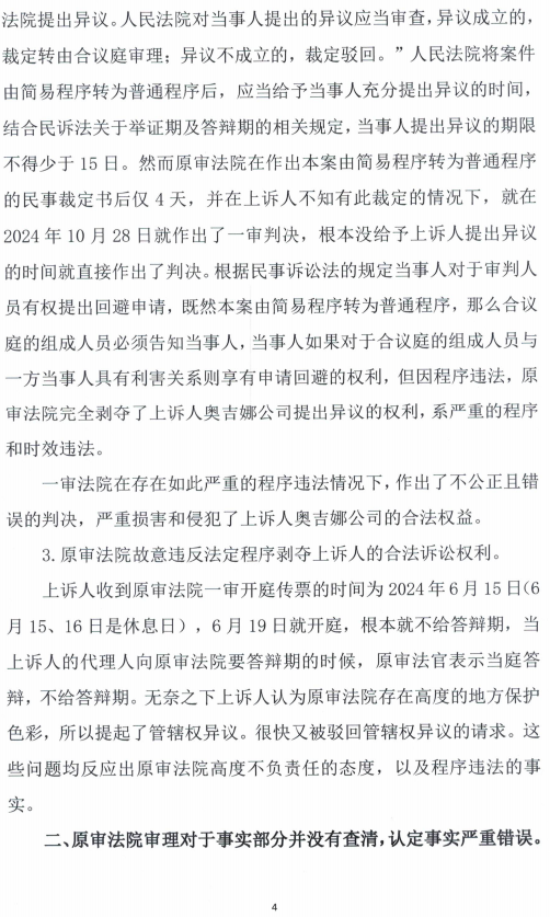 6、因發(fā)現(xiàn)一審判決和裁定存在先判決,后質(zhì)證;簡易程序轉(zhuǎn)為普通程序的裁定書與判決書同日送達等肆無忌憚的程序嚴重違法行為和判決內(nèi)容也與奧吉娜公司舉報不符,奧吉娜公司于2024年11月11日向一審法院遞交上訴狀,請求“1.人民法院依法撤銷固始縣人民法院民事判決書(2024)豫1525民初6011號民事判決書,依法改判駁回被上訴人全部訴訟請求或?qū)⒈景赴l(fā)回重審;2.本案一審、二審訴訟費由被上訴人承擔。”同時,對法官陳陽的嚴重違法行為向人大、紀監(jiān)委進行檢舉。