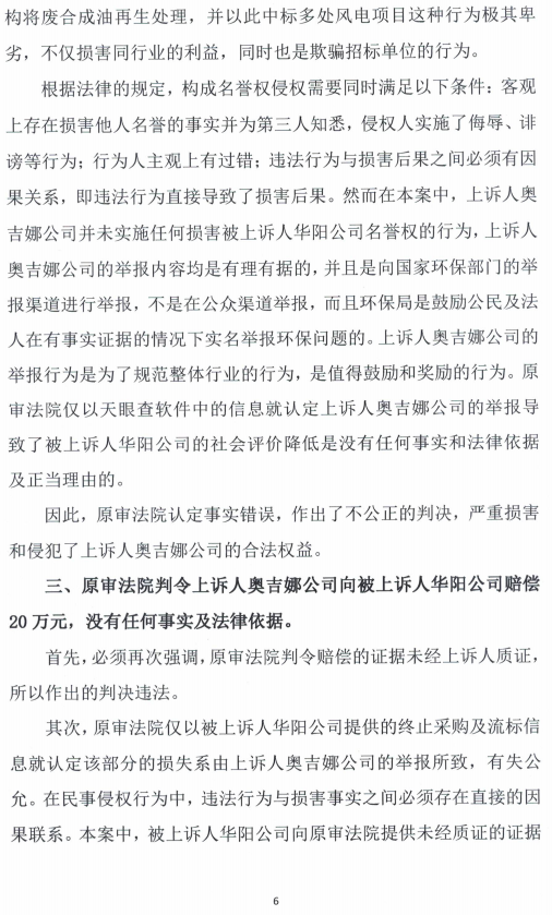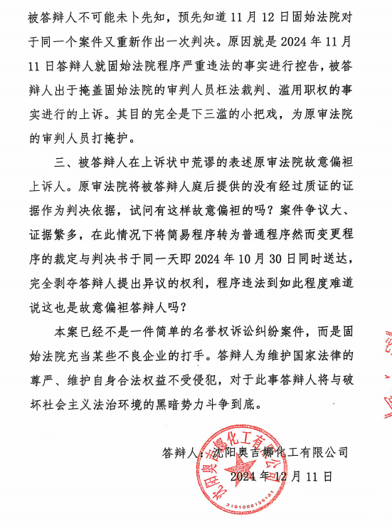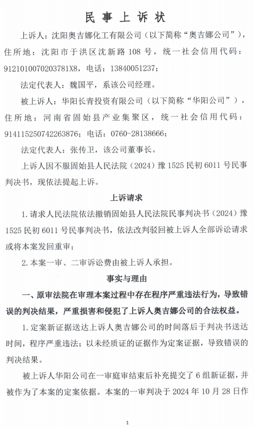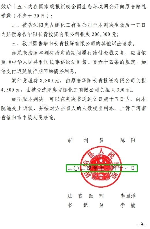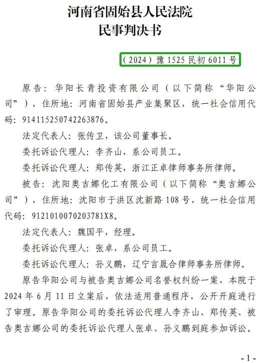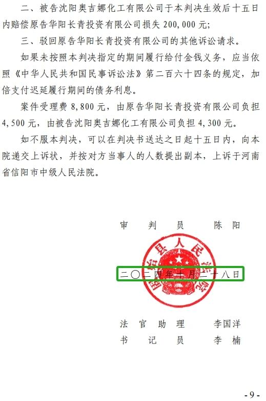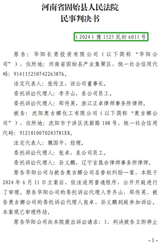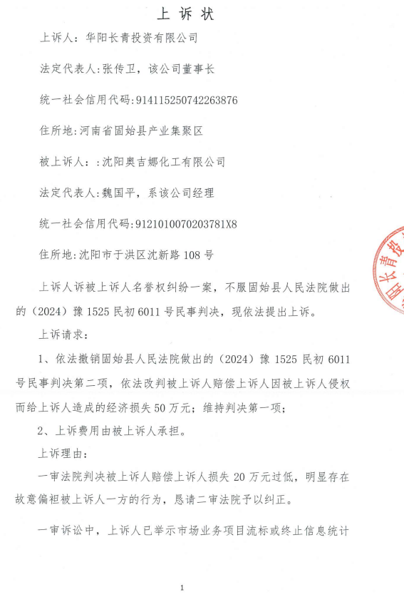 5、2024年10月30日,奧吉娜公司收到固始縣法院日期為2024年10月28日的《民事判決書》(2024)豫 1525 民初 6011 號。判決長青公司勝訴如下:“一、被告沈陽奧吉娜化工有限公司立即停止對原告華陽長青投資有限公司的舉報、投訴等名譽侵權(quán)行為,并于本判決生效后十五日內(nèi)在國家級報紙或全國生態(tài)環(huán)境網(wǎng)公開向原告賠禮道歉(不少于 30 日); 二、被告沈陽奧吉娜化工有限公司于本判決生效后十五日內(nèi)賠償原告華陽長青投資有限公司損失200,000 元; 三、駁回原告華陽長青投資有限公司的其他訴訟請求。 案件受理費8,800元,由原告華陽長青投資有限公司負擔4,500元,由被告沈陽奧吉娜化工有限公司負擔4,300元。”