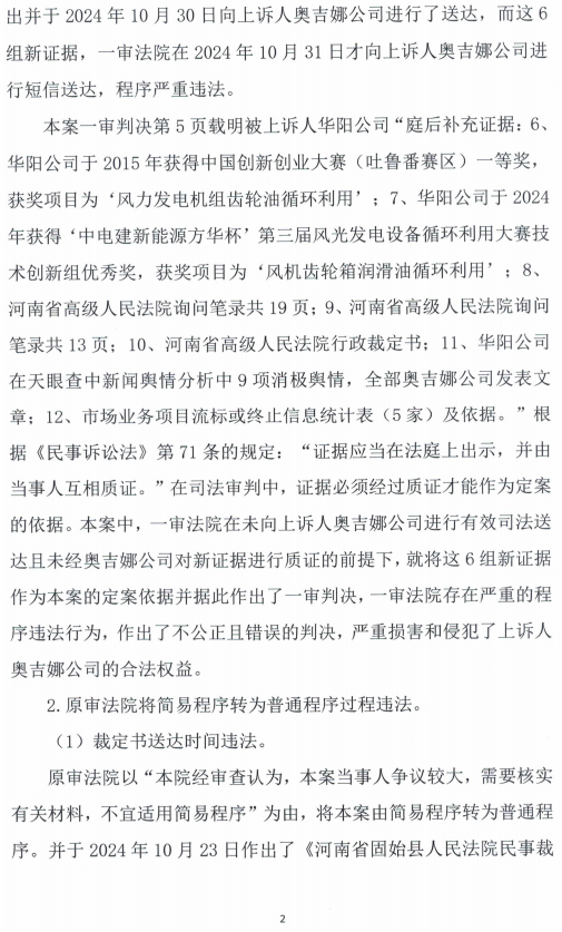 9、2024年12月12日9時30分,華陽長青公司起訴奧吉娜公司侵犯名譽權(quán)糾紛案[(2024)豫15民終5218號],二審在信陽市中級人民法院開庭。