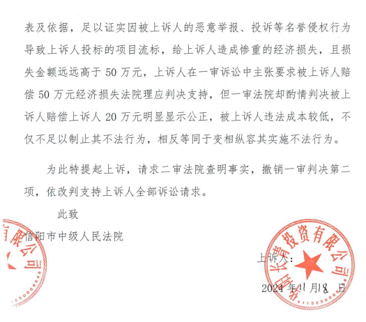 8、2024年11月18日,華陽長青公司提交《上訴狀》(依據(jù)第一個判決書,上訴已超時),請求“1、依法撤銷固始縣人民法院做出的(2024)豫1525 民初 6011號民事判決第二項,依法改判被上訴人賠償上訴人因被上訴人侵權(quán)而給上訴人造成的經(jīng)濟損失50萬元;維持判決第一項;2、上訴費用由被上訴人承擔。”