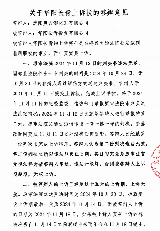 針對一審法院陳陽法官一案兩判決書嚴重違法行為和長青公司的上訴,奧吉娜公司在答辯中犀利指證: