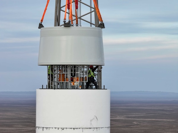 該首臺套風(fēng)電機(jī)組并網(wǎng),標(biāo)志著全球規(guī)?;逃米畲蠡焖L(fēng)力發(fā)電機(jī)組在內(nèi)蒙古能源集團(tuán)成功發(fā)電運(yùn)行。項目使用的風(fēng)電設(shè)備單機(jī)容量10兆瓦,混塔高134.4米,整機(jī)高度140米,葉片長112米,風(fēng)輪直徑230米,覆蓋及掃風(fēng)面積更大,經(jīng)濟(jì)性和發(fā)電量相對更高。值得一提的是,此項目風(fēng)機(jī)塔筒由鋼筋混凝土中空、重力式基礎(chǔ)+上部高強(qiáng)混凝土預(yù)制管片疊合而成,是國內(nèi)首次采用內(nèi)張拉、預(yù)應(yīng)力技術(shù)的10兆瓦混塔風(fēng)力發(fā)電項目。塔筒內(nèi)部預(yù)留孔洞固定鋼纜,鋼纜固定后進(jìn)行水泥灌漿填充縫隙,風(fēng)機(jī)運(yùn)行中旋轉(zhuǎn)產(chǎn)生擺動,使用此技術(shù),在擺動時,塔筒內(nèi)部結(jié)構(gòu)均勻受力,整體擺幅程度大大降低,使塔筒整體性更好、耐久性更強(qiáng)、預(yù)應(yīng)力損失小,混塔結(jié)構(gòu)塔筒優(yōu)勢突出。
