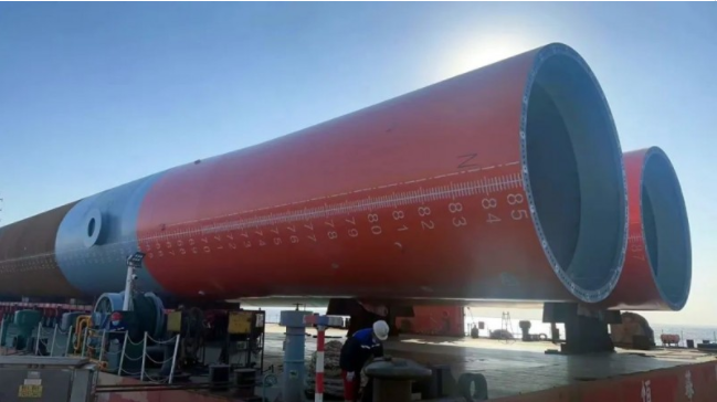 近日,子公司潤邦海洋為天津港航工程有限公司建造的1#、2#海上風電基礎(chǔ)樁順利發(fā)運,迎來了2023年項目交付的“開門紅”,也為圓滿完成2023年任務(wù)目標打開了新局面。1#基礎(chǔ)樁樁長87米,直徑8米,樁重1,339.64噸,2#基礎(chǔ)樁樁長85米,直徑8米,樁重1,305.97噸。