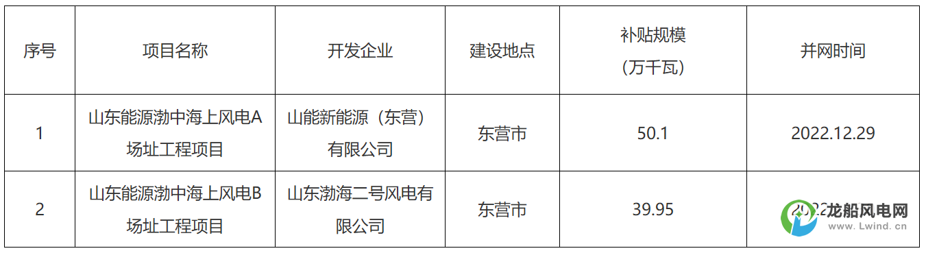 公告顯示,山東省能源局結(jié)合《山東省海上風(fēng)電財(cái)政補(bǔ)貼實(shí)施細(xì)則》有關(guān)規(guī)定,組織專家組對(duì)東營市上報(bào)的2022年度建成并網(wǎng)海上風(fēng)電項(xiàng)目財(cái)政補(bǔ)貼申請(qǐng)材料進(jìn)行了復(fù)審。經(jīng)復(fù)審,東營市上報(bào)的兩個(gè)海上風(fēng)電項(xiàng)目補(bǔ)貼申請(qǐng)材料符合要求,項(xiàng)目基本信息及補(bǔ)貼規(guī)模公示如下: