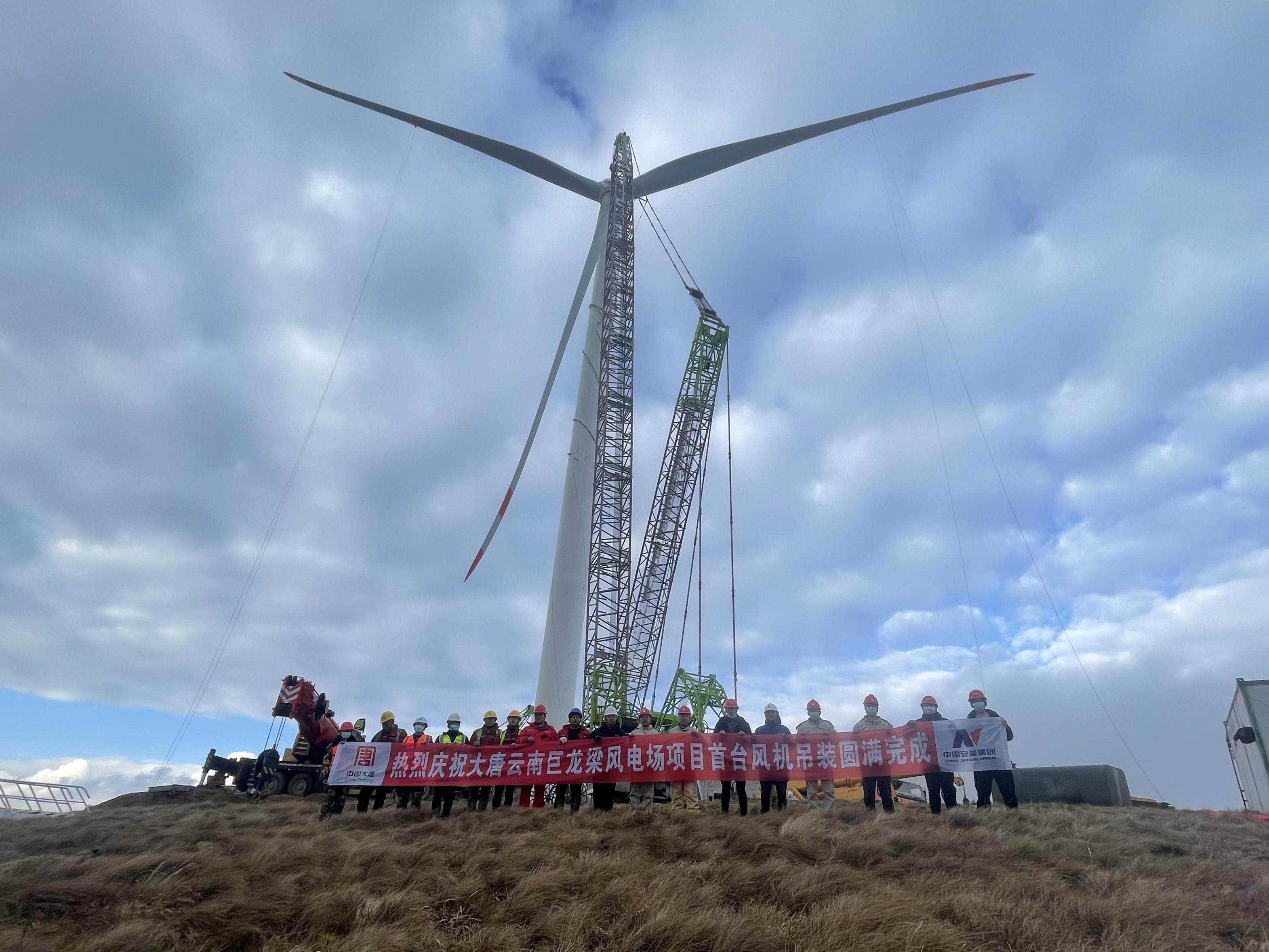 12月20日下午17時,在中國安能二局承建的云南巨龍梁風(fēng)電項目(一期)工程建設(shè)現(xiàn)場,隨著最后一顆螺栓安裝完畢,一臺全國單機容量最大的6.7兆瓦高原山地風(fēng)機成功吊裝,葉輪直徑達到了191米,成功刷新了世界高原山地風(fēng)機建設(shè)記錄,是名副其實的風(fēng)電巨人。