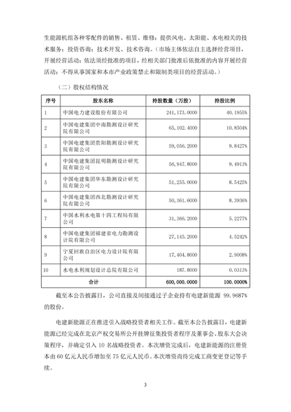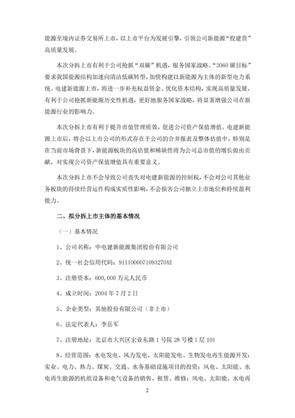 根據公告,擬拆分的中電建新能源集團股份有限公司注冊資本為60億元,經營范圍包括水電發(fā)電、風力發(fā)電、太陽能發(fā)電、生物發(fā)電再生能源開發(fā)等。目前,電建新能源正在推進引入戰(zhàn)略投資者相關工作。