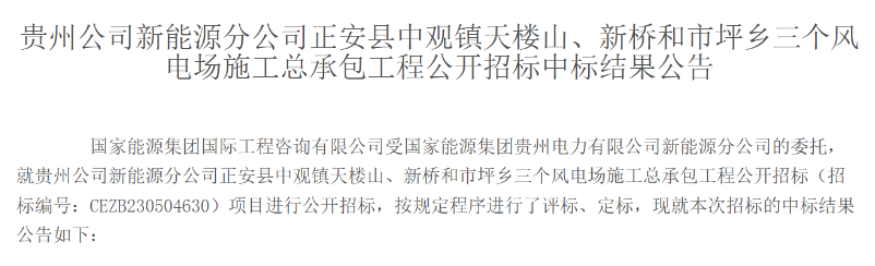 7月25日,國(guó)家能源招標(biāo)網(wǎng)發(fā)布《貴州公司新能源分公司正安縣中觀鎮(zhèn)天樓山、新橋和市坪鄉(xiāng)三個(gè)風(fēng)電場(chǎng)施工總承包工程公開(kāi)招標(biāo)中標(biāo)結(jié)果公告》。