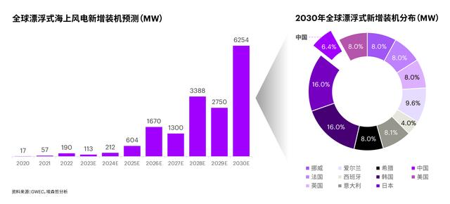 海上風(fēng)電向深遠(yuǎn)海域進(jìn)發(fā):漂浮式風(fēng)電為加速進(jìn)軍深遠(yuǎn)海域開辟了新前景。全球已有202.55MW的漂浮式風(fēng)電項(xiàng)目投運(yùn),2023-2025年將有530MW漂浮式風(fēng)電項(xiàng)目投運(yùn)4。根據(jù)GWEC的預(yù)測(cè),2026年將實(shí)現(xiàn)漂浮式風(fēng)電的商業(yè)化。預(yù)計(jì)到2030年,漂浮式風(fēng)電裝機(jī)規(guī)模將顯著增長,其中中國新增裝機(jī)容量將達(dá)400MW,占全球新增的6.4%。