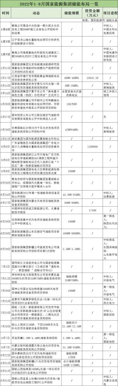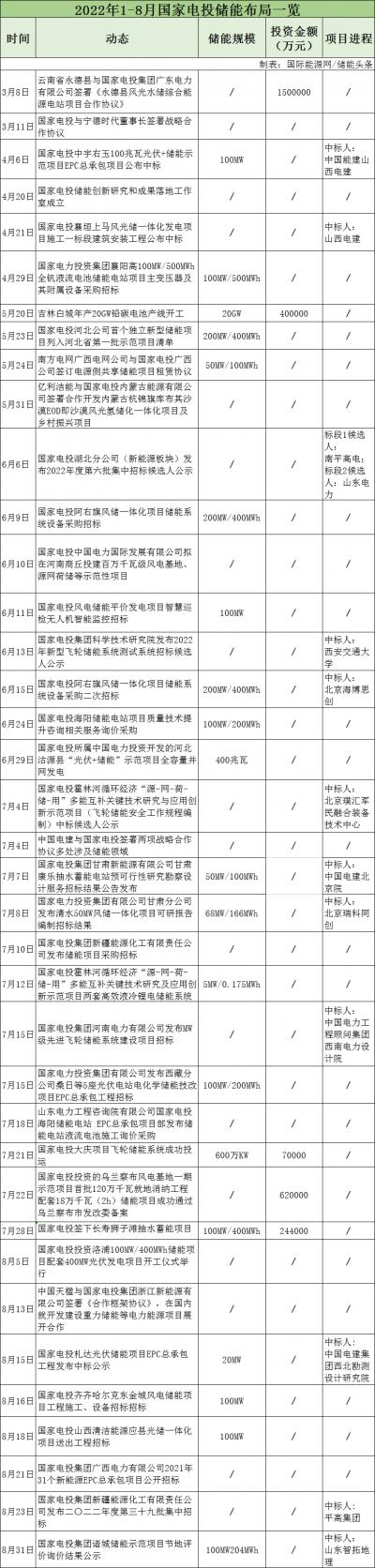 據(jù)不完全統(tǒng)計,2022年1-8月,國家電投與寧德時代、中國電建、中國天楹等簽訂合作協(xié)議,圍繞儲能材料、風(fēng)光氫儲、重力儲能等方面進行合作。儲能項目招標(biāo)26個,涉及飛輪儲能、液流電池、鉛炭電池、抽水蓄能及智慧新能源等方面。
