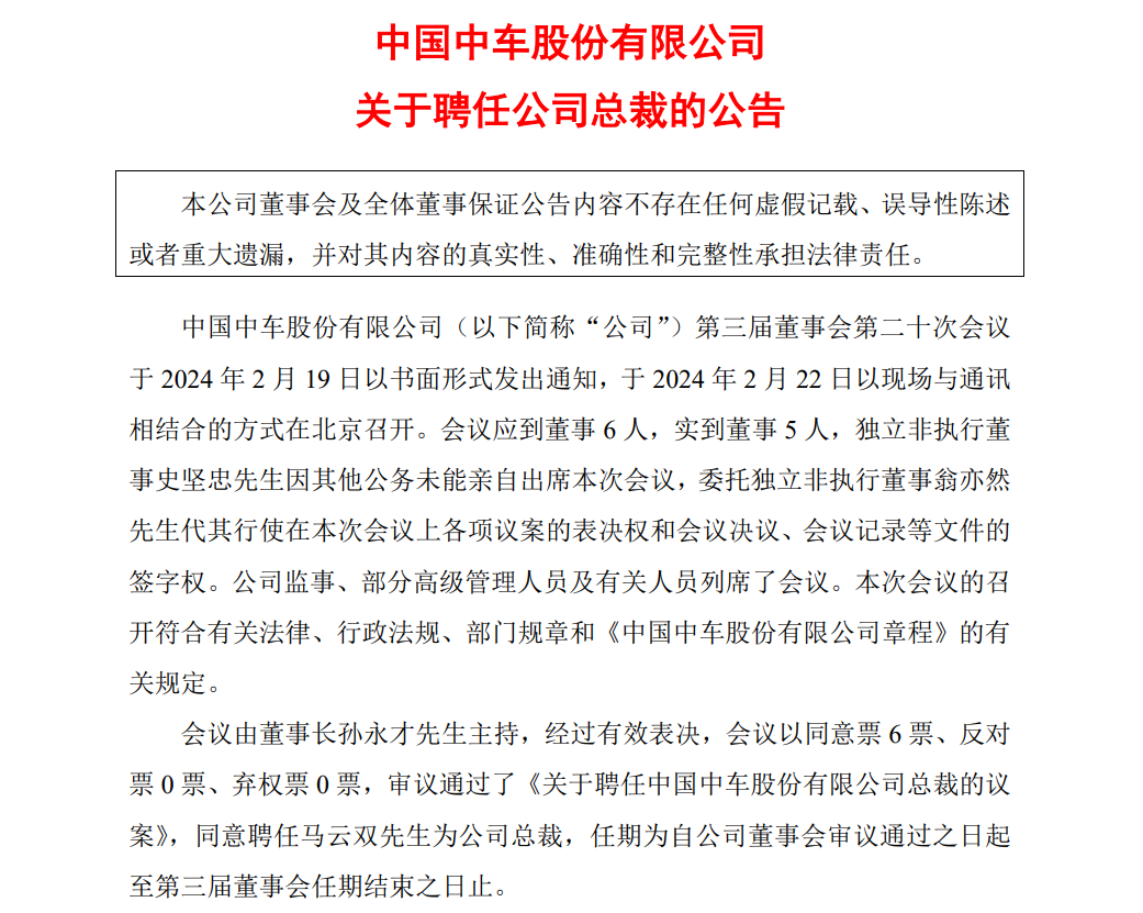 公告披露,中國中車召開第三屆董事會(huì)第二十次會(huì)議,審議通過了《關(guān)于聘任中國中車股份有限公司總裁的議案》,同意聘任馬云雙先生為公司總裁,任期為自公司董事會(huì)審議通過之日起至第三屆董事會(huì)任期結(jié)束之日止。