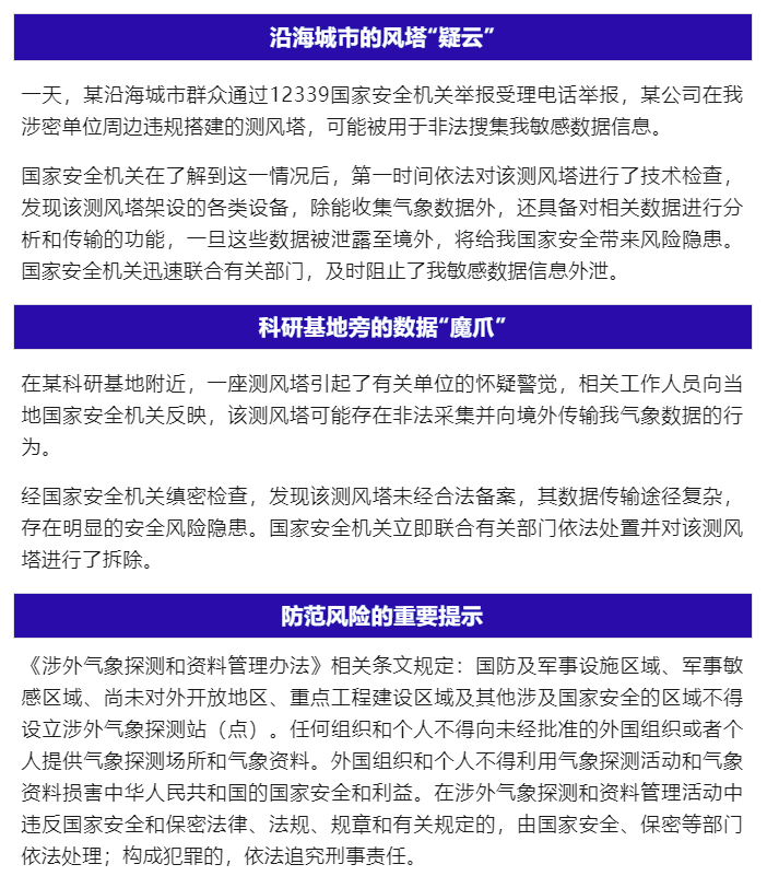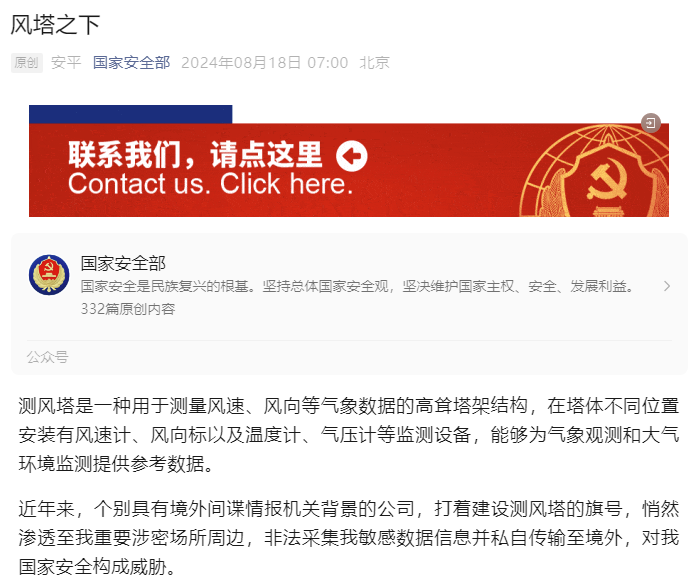 8月18日,據(jù)國家安全部官微消息,近年來,個(gè)別具有境外間諜情報(bào)機(jī)關(guān)背景的公司,打著建設(shè)風(fēng)電測風(fēng)塔的旗號,悄然滲透至我重要涉密場所周邊,非法采集我敏感數(shù)據(jù)信息并私自傳輸至境外,對我國家安全構(gòu)成威脅。