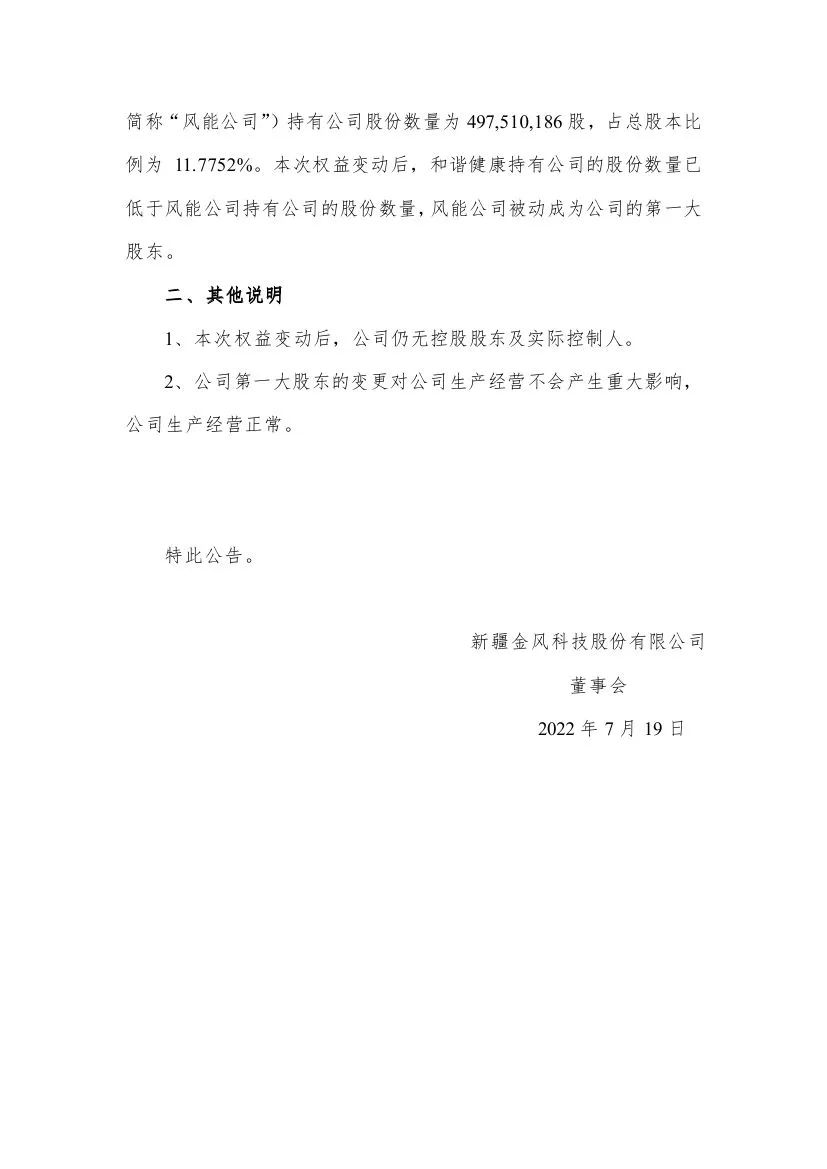 金風科技日前發(fā)布《關(guān)于第一大股東變更的提示性公告》。截至2022年7月19日,公司原第一大股東和諧健康保險股份有限公司-萬能產(chǎn)品(簡稱“和諧健康”)所持公司的股份數(shù)量占總股本比例減少至11.7356%,原第二大股東新疆風能有限責任公司(簡稱“風能公司”)被動成為公司的第一大股東。